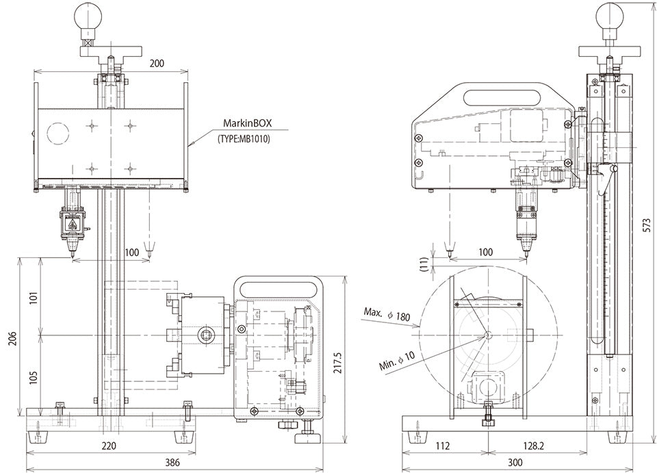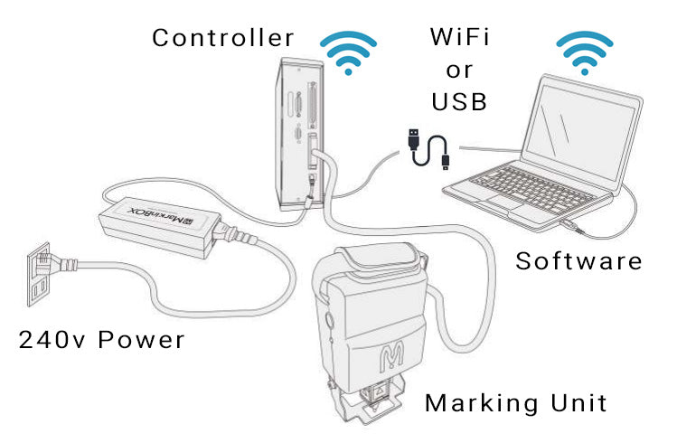 This package comes with the rotary chuck and everything required to run it. The MB2s controller is upgraded with a chip to allow it to drive the rotary chuck in sync with the marking head. The cable is also upgraded with additional wires for communication between the chuck and rotary unit.